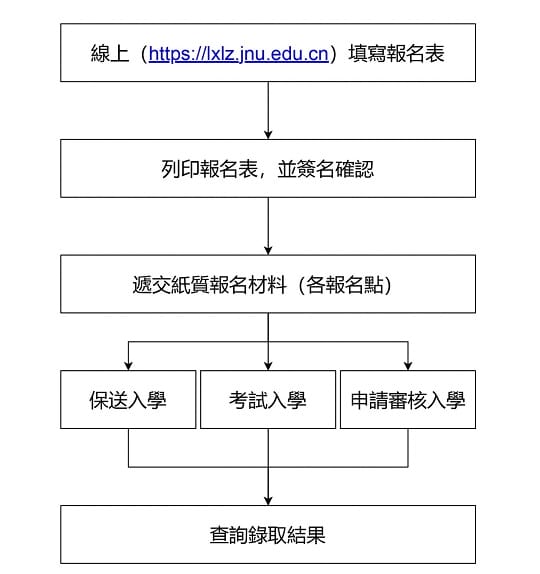 考生需登入报名网填写报名信息,经提交成功后,生成《暨南大学、华侨大学招收港澳台侨学生和华人及其他外籍学生报名表》(注意:表格不设下载链接),再打印报名表,核对无误后,签名确认,并附上所需报名材料到各报名点办理现场确认,同时缴付报名费。