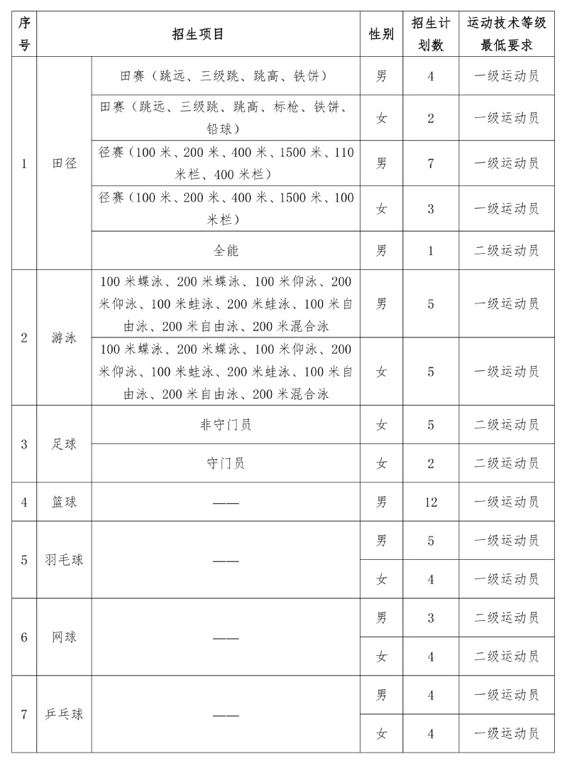 我校招生项目包括:篮球、足球、田径(田赛、径赛、全能)、羽毛球、网球、乒乓球、游泳。招生计划总数为70名(不含保送),按照上级部门规定,各项目最终招生人数视我校生源实际情况和项目需求而定。各项目具体要求如下:
